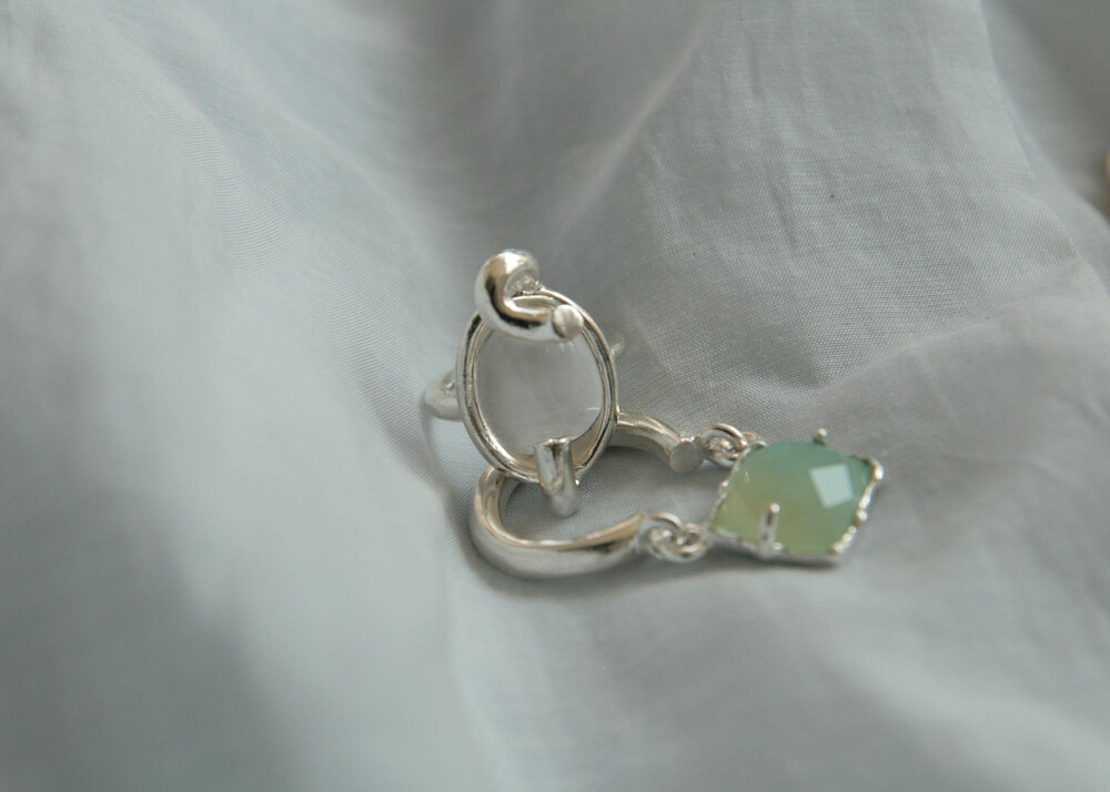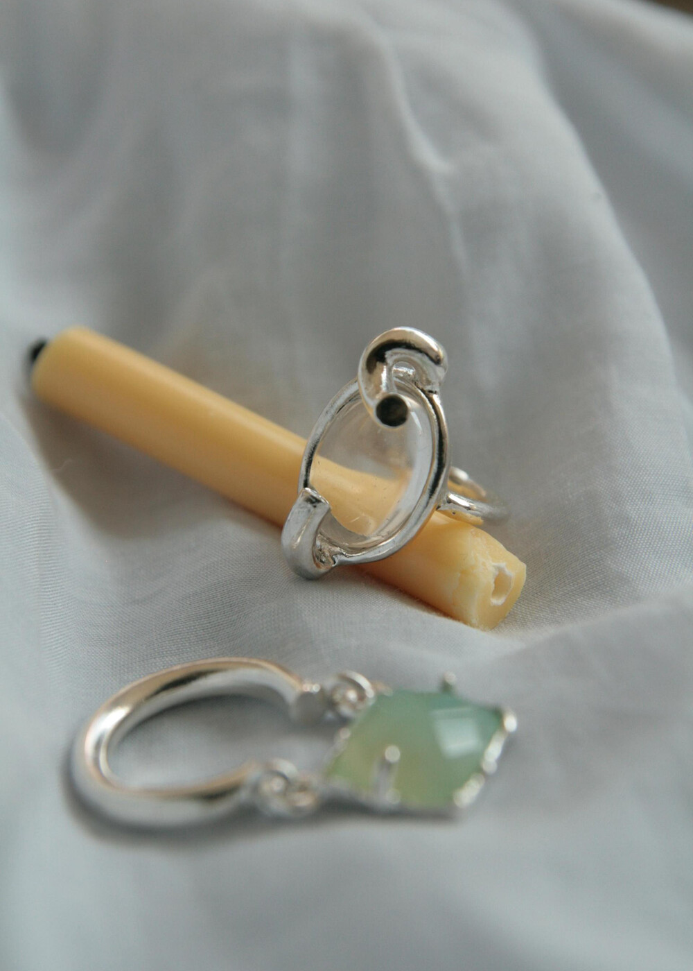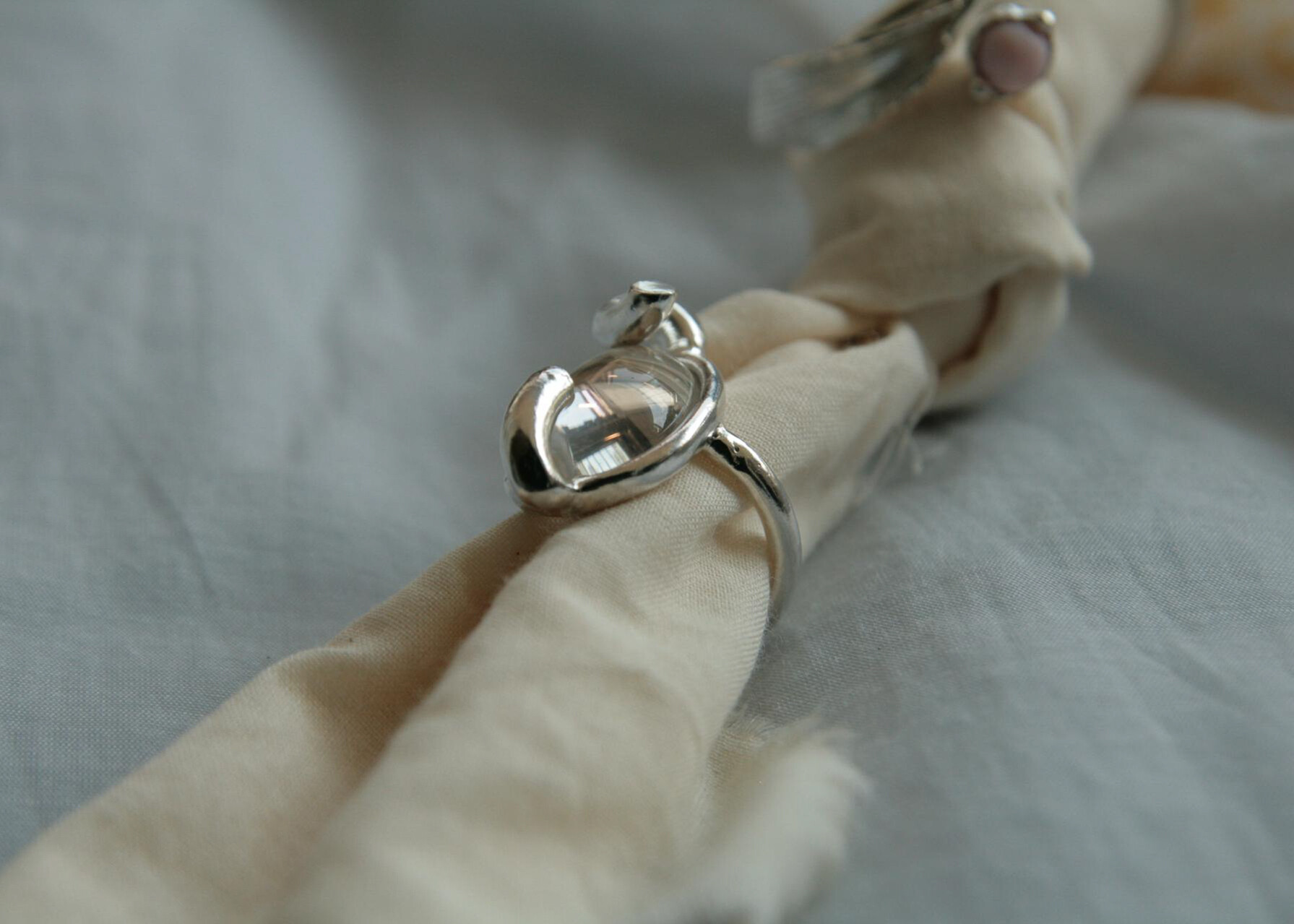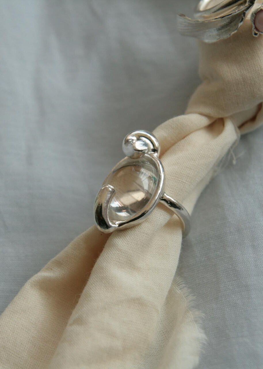 Memories of gold 의 쥬얼리, A Window of Funs. 볼록한 돔 형태의 창문과 같은 투명한 백수정을 잡고 있는 꼬아진 선. 착용시 스킨 컬러가 그대로 비치는게 매력적인 백수정의 링입니다.