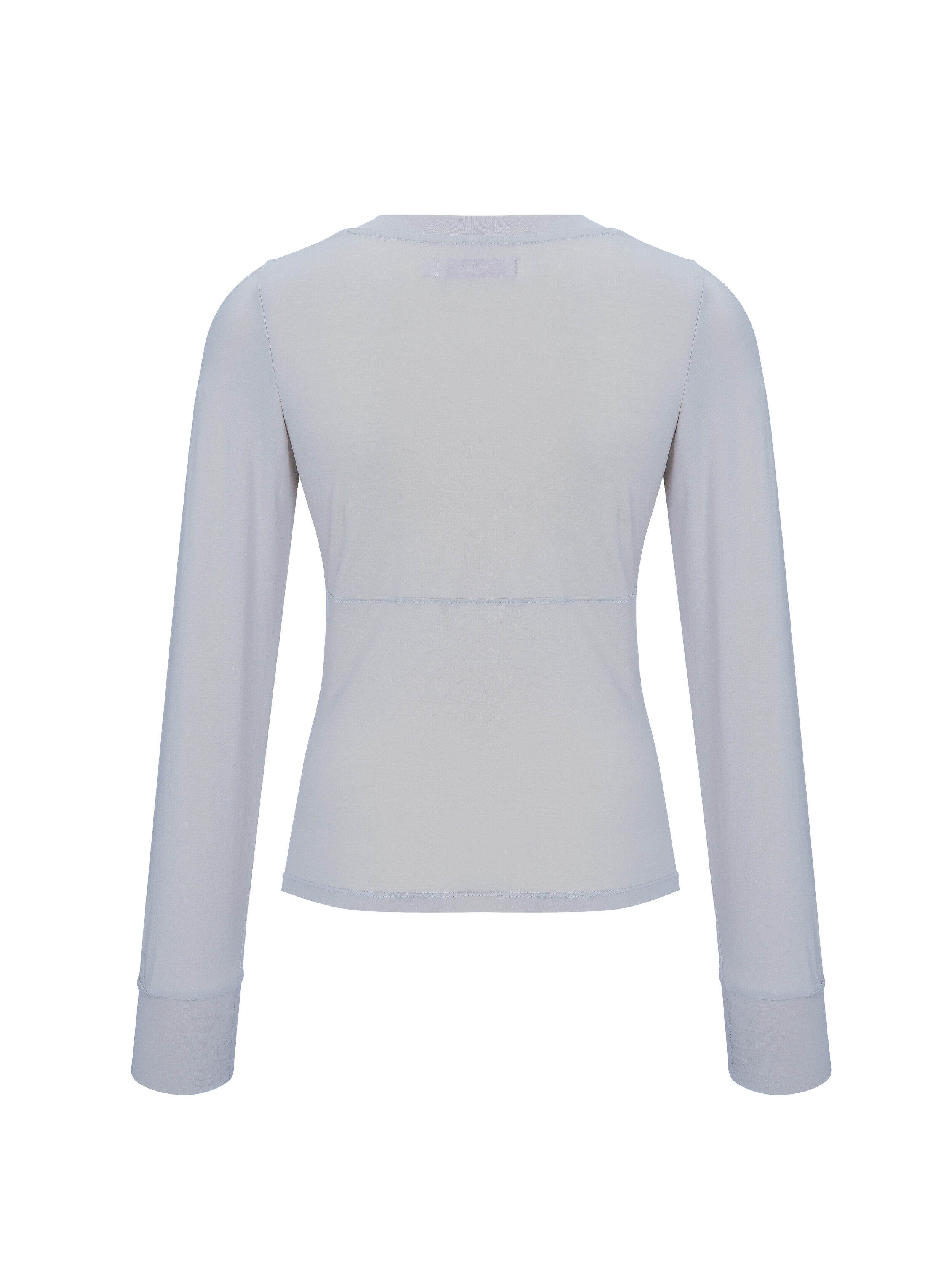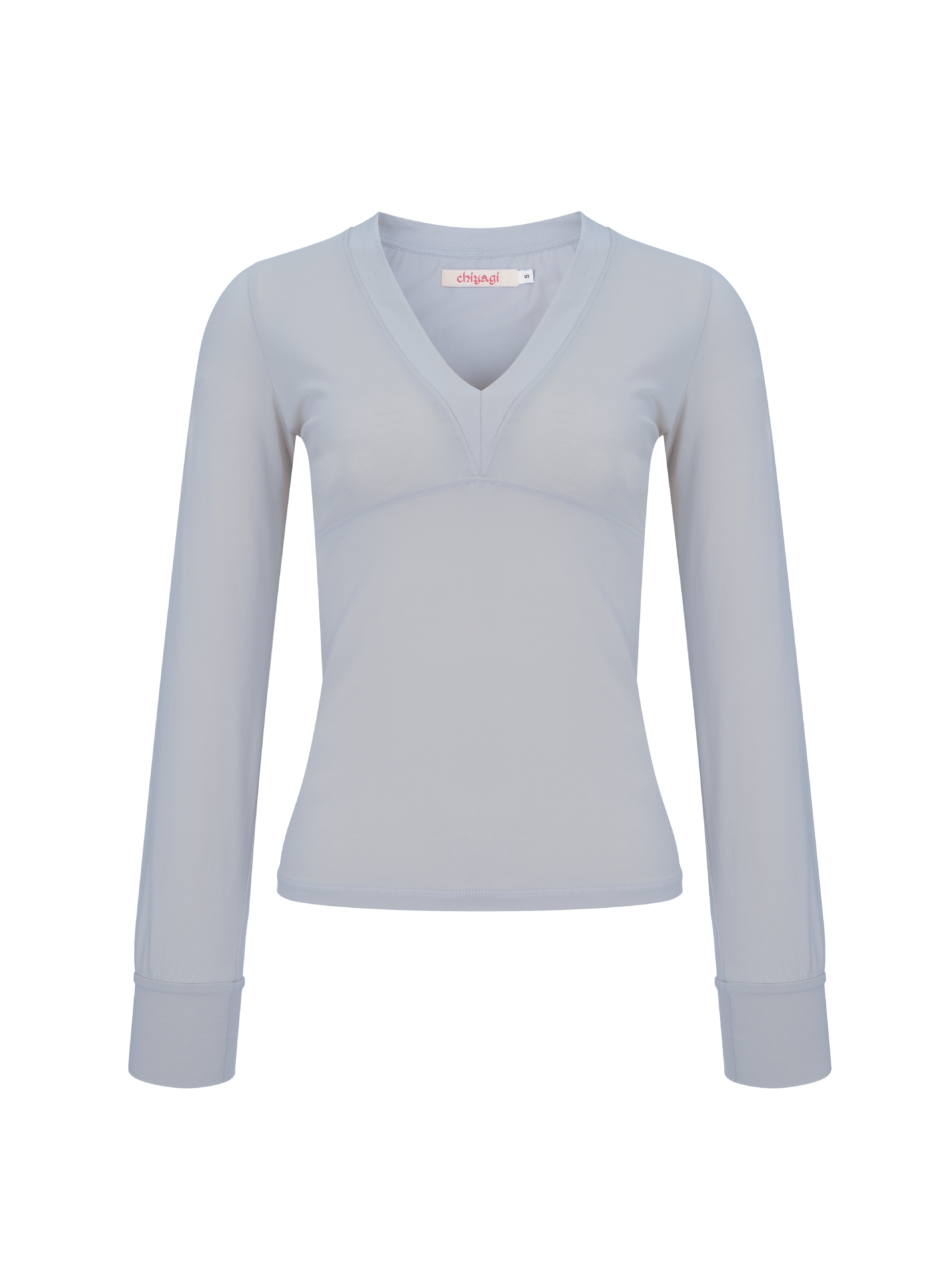 좁고 깊은 브이넥 쉐입과 프론트 패널 구성이 포인트가 되는 탑. 볼륨감 있는 소매 디자인과 넓게 잡힌 소매 커프가 클래식한 뉘앙스를 돋보이게 합니다.