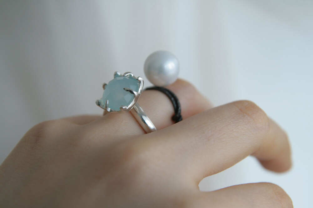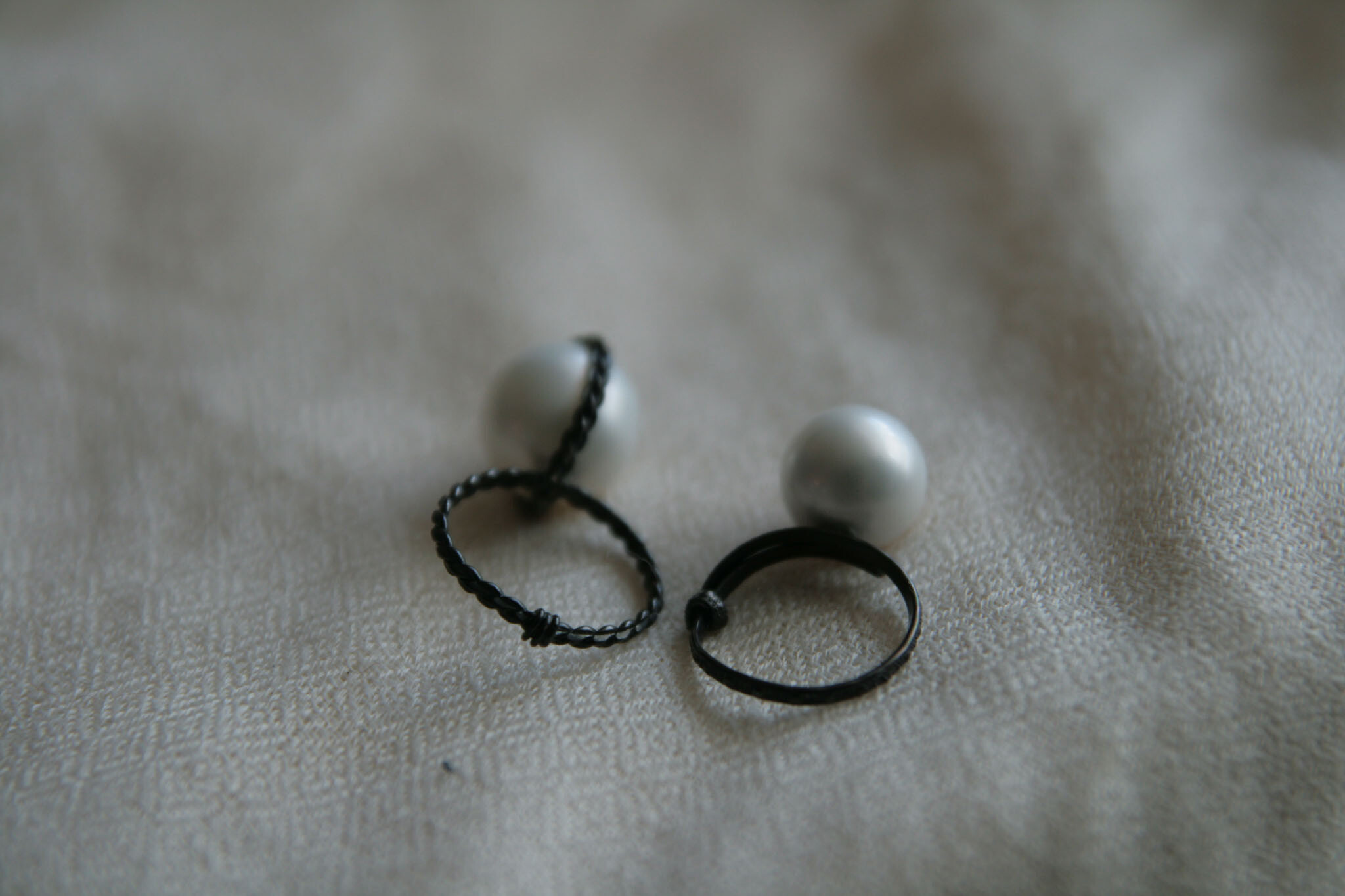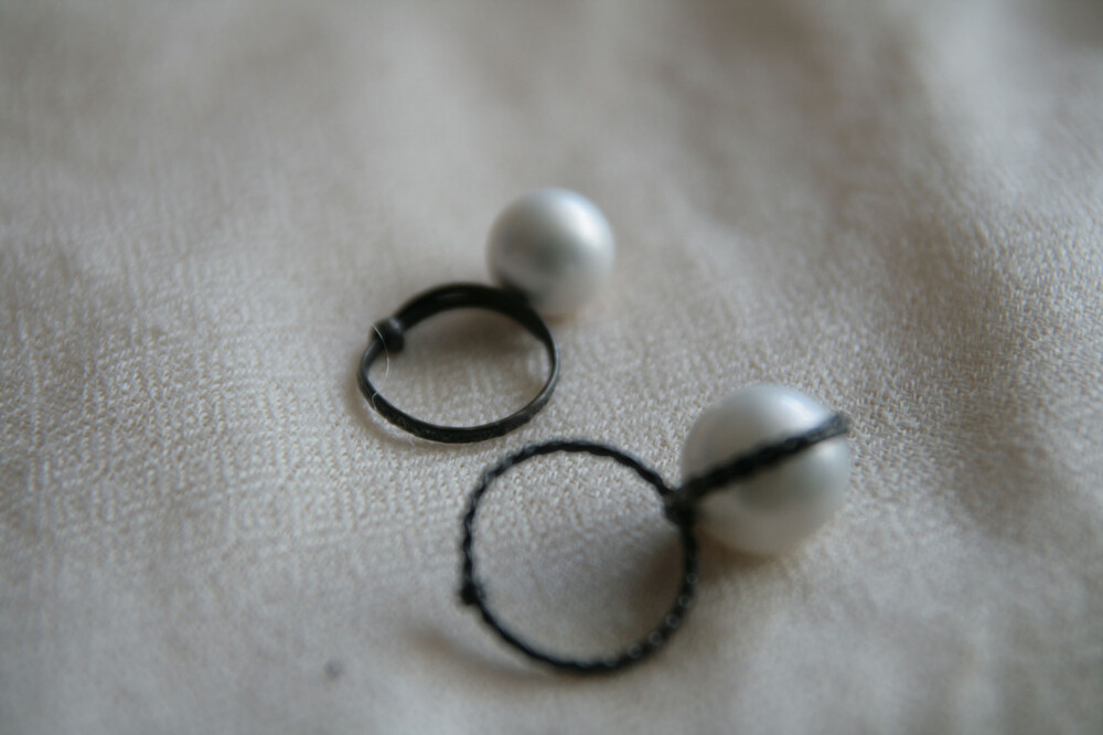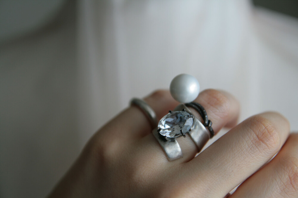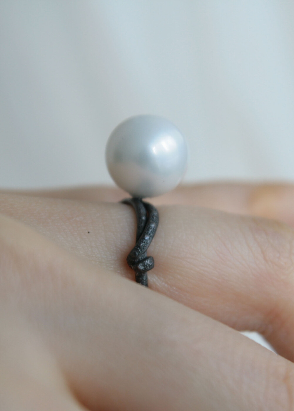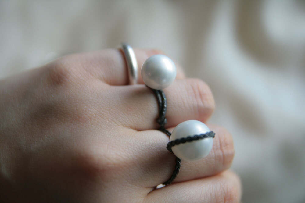 Memories of gold 의 쥬얼리, Big pearl knot Ring. 화이트 펄과 어두운 라인의 대비감이 모던한 무드를 주는 반지입니다. 메모리즈 오브 골드의 피스들은 모두 원앤온리 one and only 상품으로, 본 디자인으로는 단 한피스만이 제작 되었습니다.