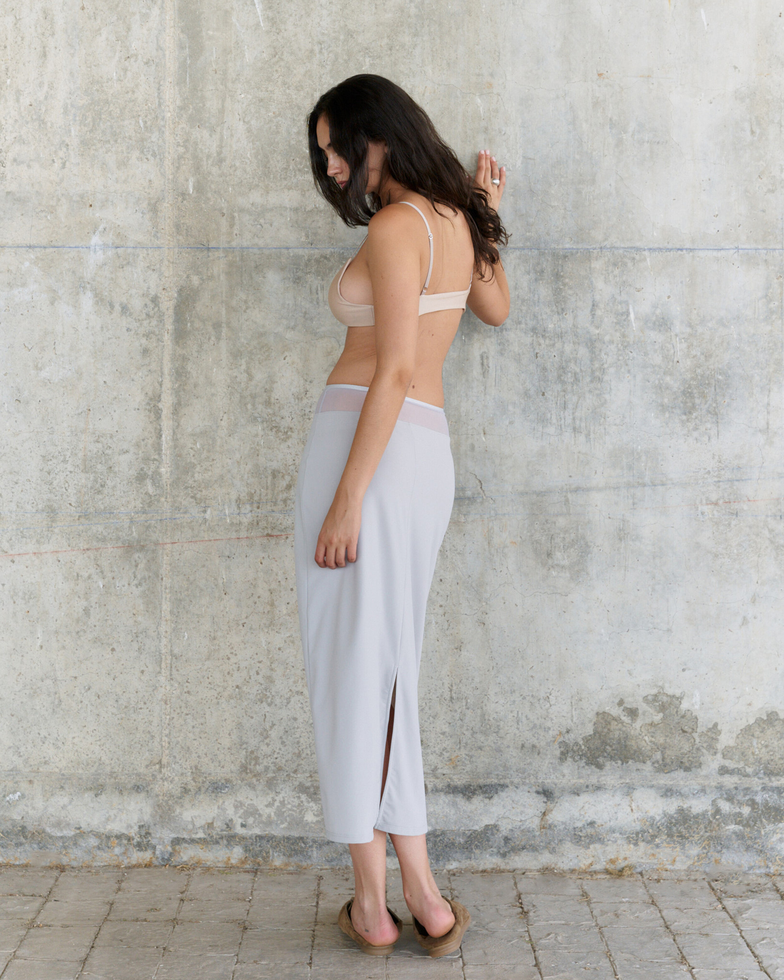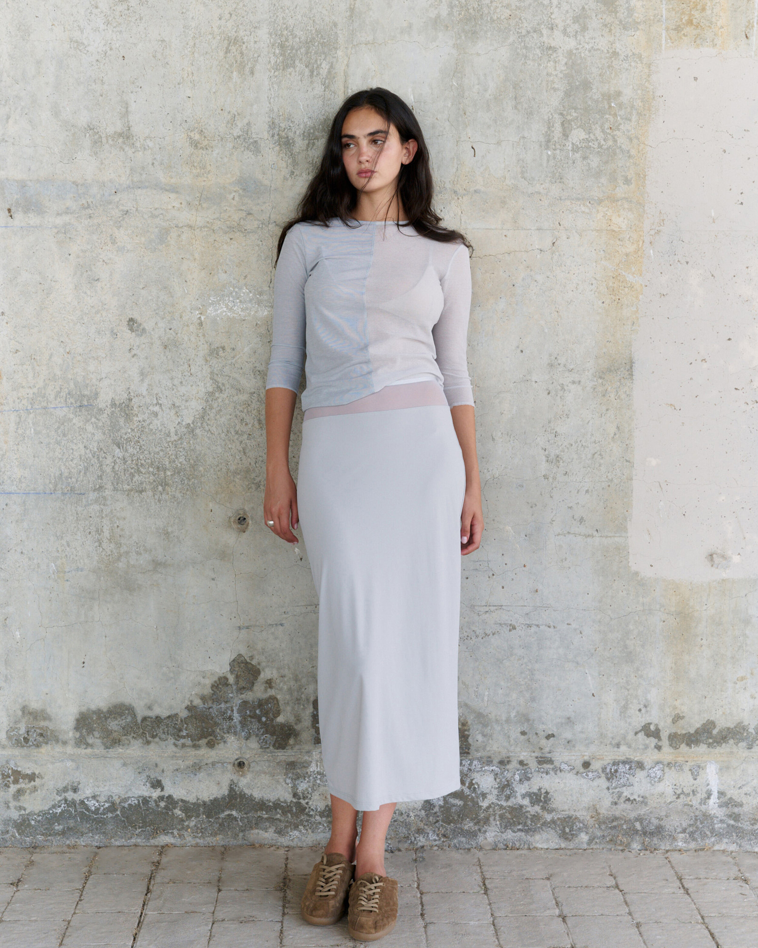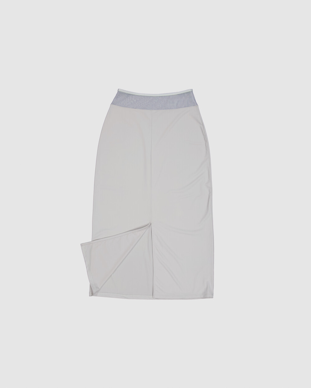 ∙ 쉬어한 허리 배색이 특징인 슬림핏 롱 져지 스커트. ∙ 허리의 같은 톤의 광택감있는 새틴 밴드 마감 디테일 ∙ 긴 뒷트임으로 편안한 움직임. ∙ 높은 신축성의 원단으로 지퍼 없이 착용
