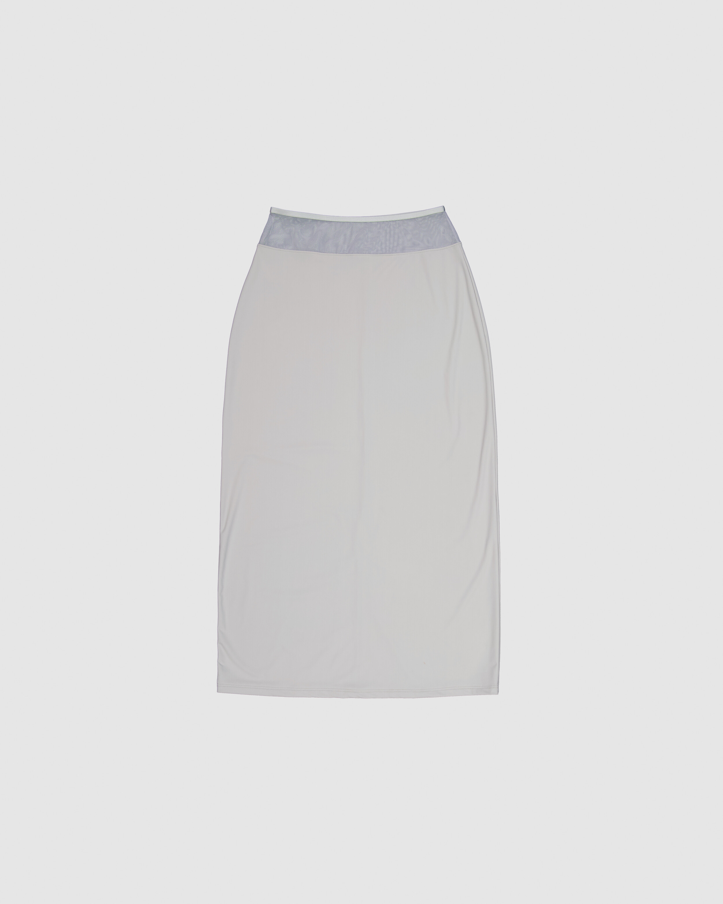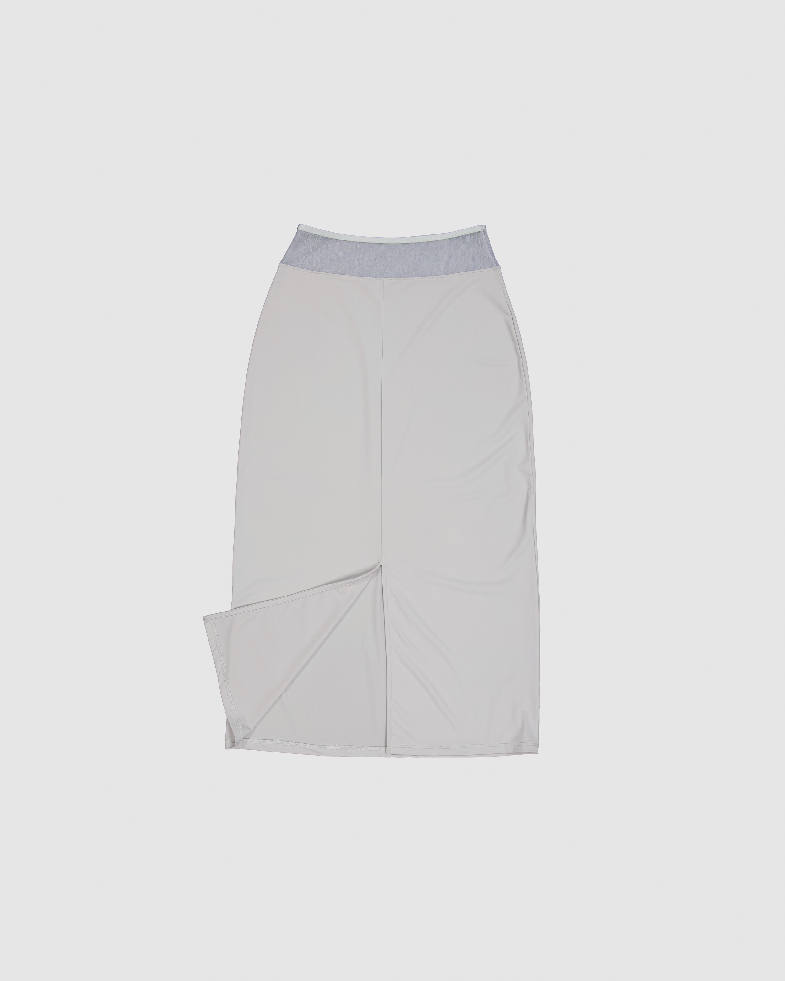 ∙ Sheer panel blocked long length skirt. ∙ Tonal satin band finish on the waist. ∙ Bias binding finish on back slit. ∙ Slim fit, Slightly tapered at hem ∙ High stretch fabric, worn without zipper.