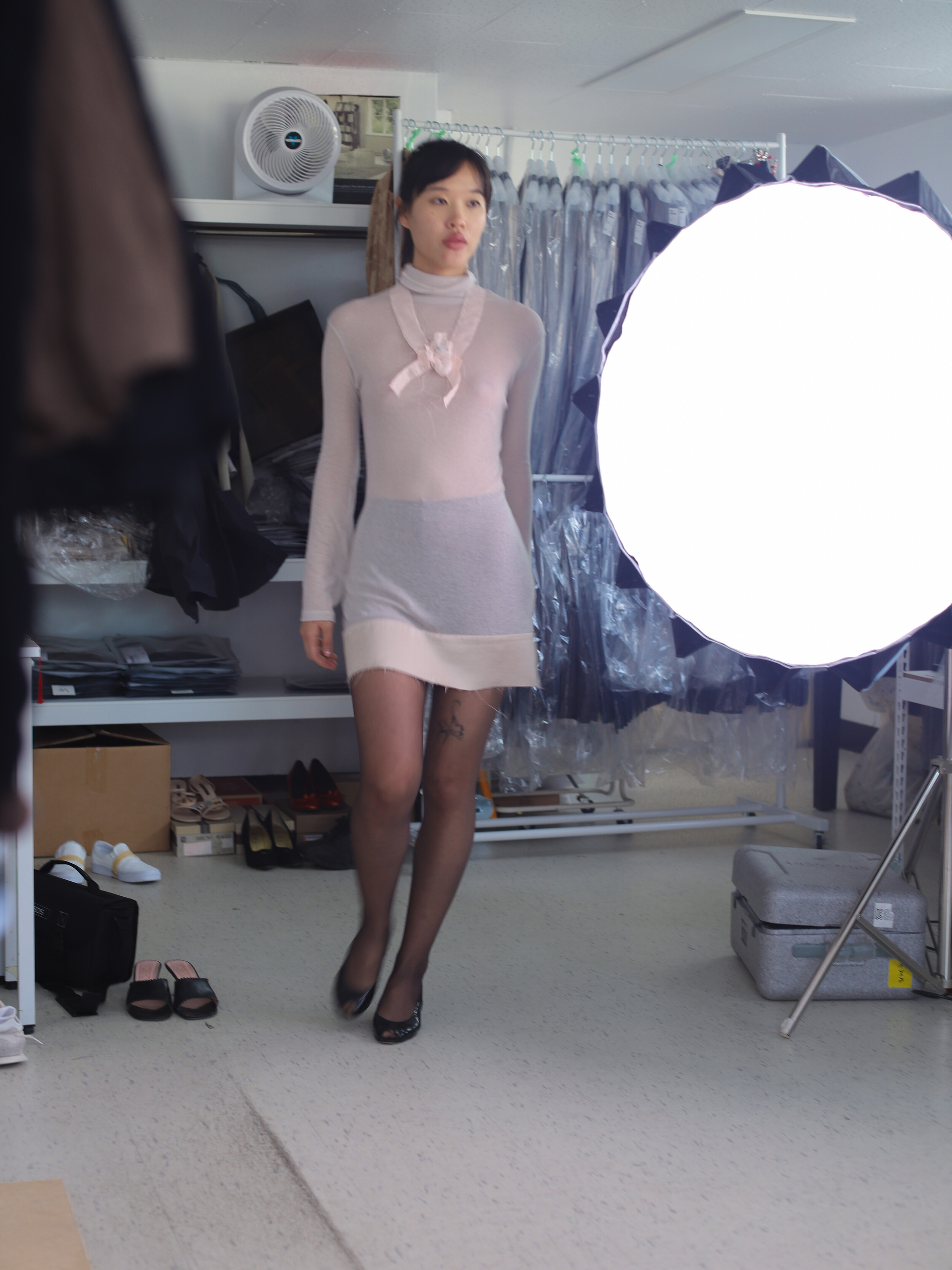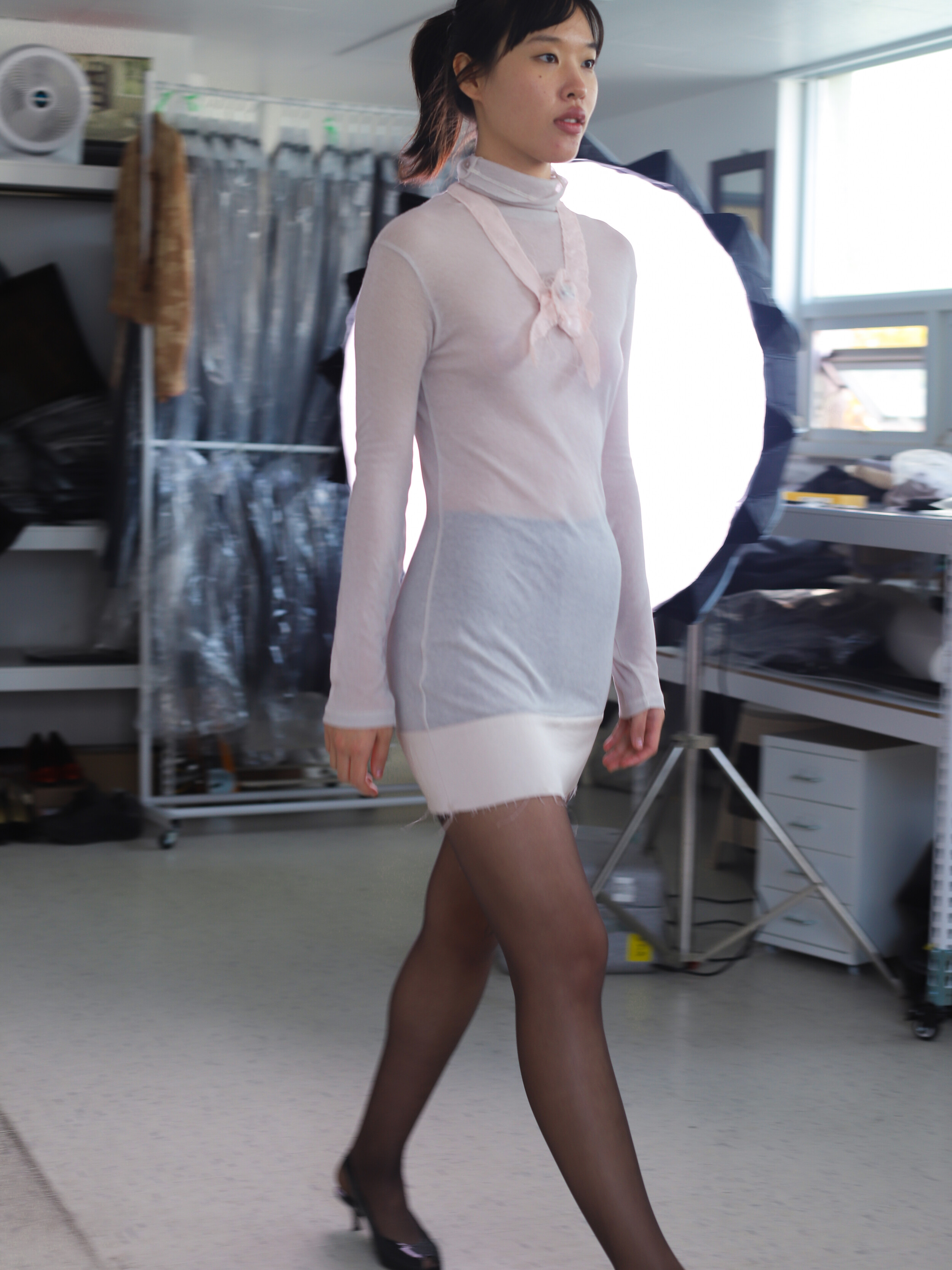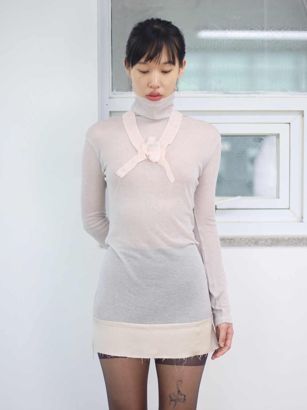 쉬어하고 따뜻한 터치감의 롱 네크 탑. 어깨에서 부터 핏하게 붙다가 벌룬 형태로 떨어져 마감되는 소매. 밑단의 새틴 패널이 6개의 바텍과 함께 마무리되어 탑 또는 미니 드레스처럼 입을 수 있는 디자인입니다.