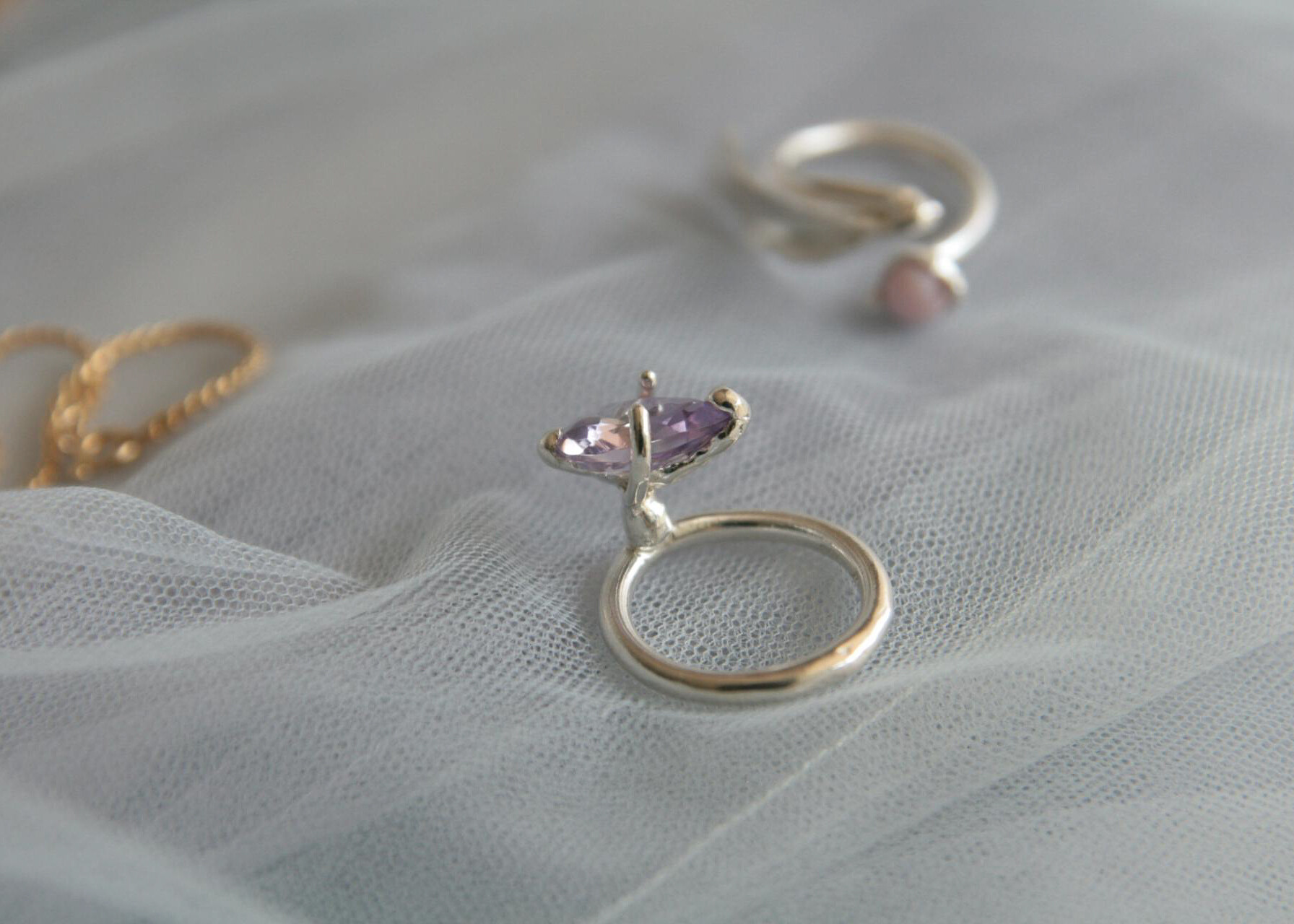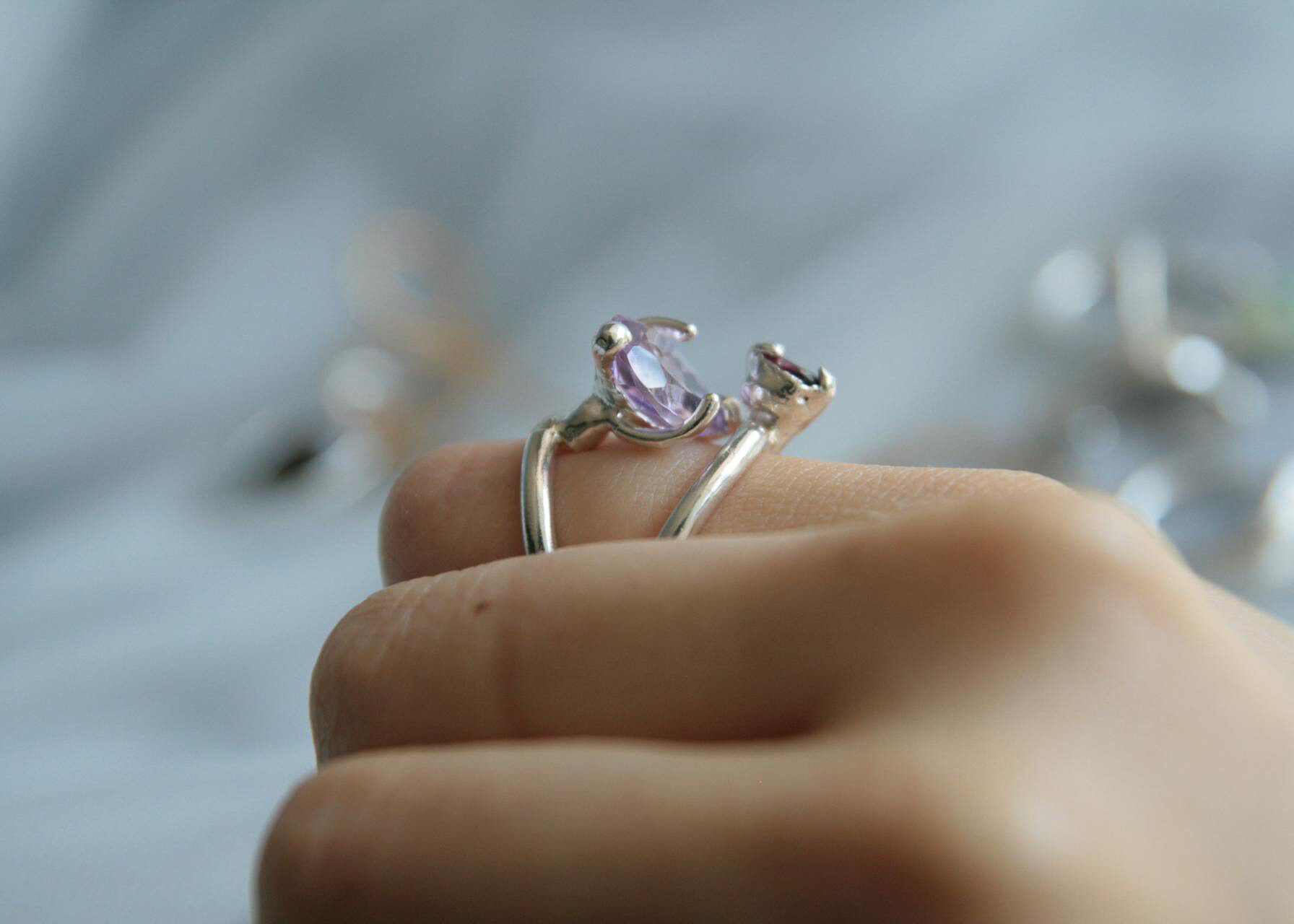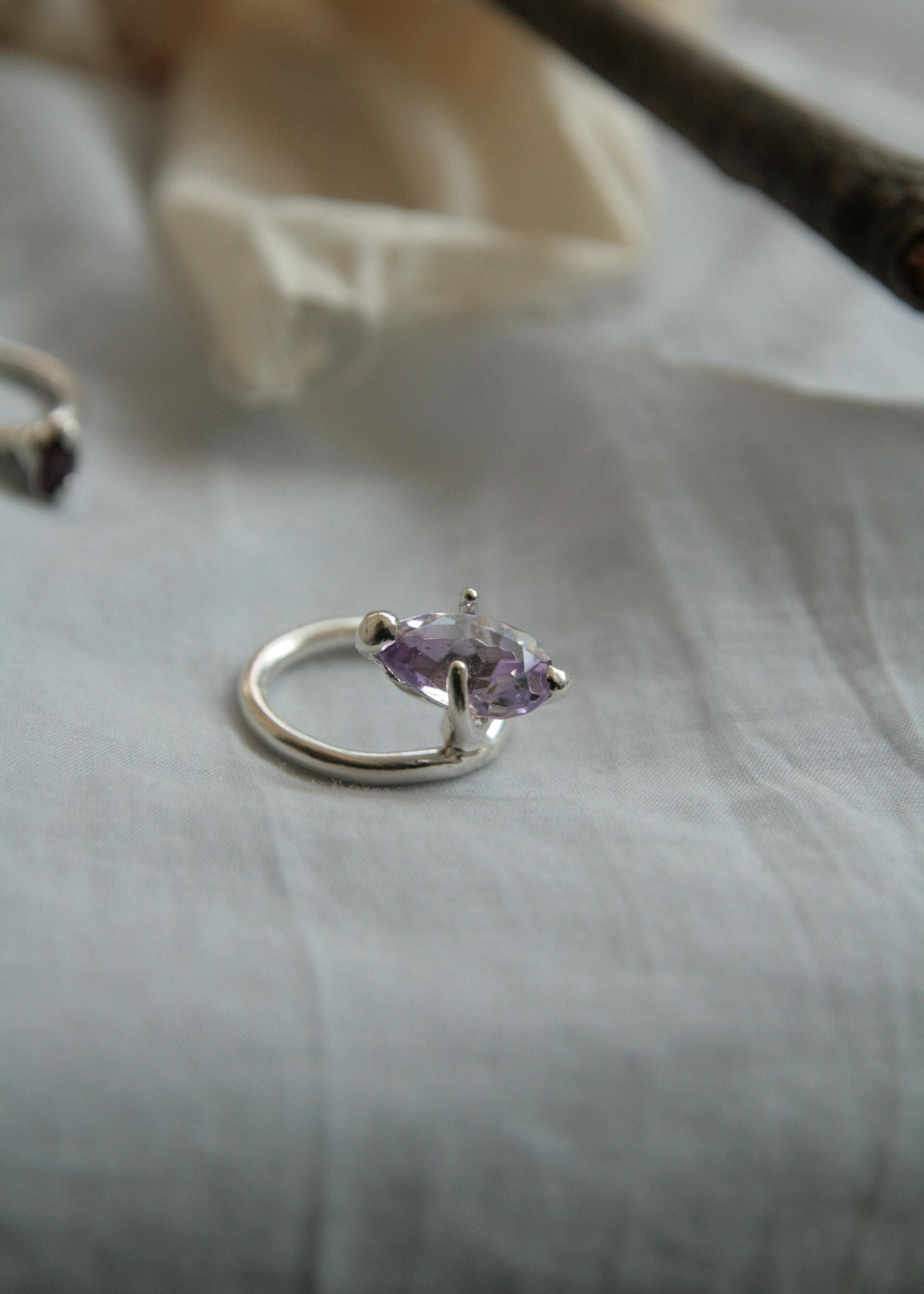 큰 물방울 형태의 자수정이 조금 다르게 세팅되어진 링. 바닥에 놓았을 때 스톤이 위를 보고, 착용하면 측면이 보이게 디자인 되어 더욱 재미있는 링입니다. 다른 링과 레이어링 했을때 시너지가 좋은 디자인 입니다.