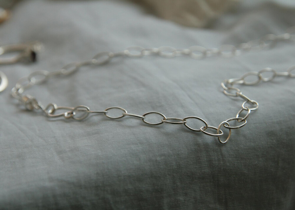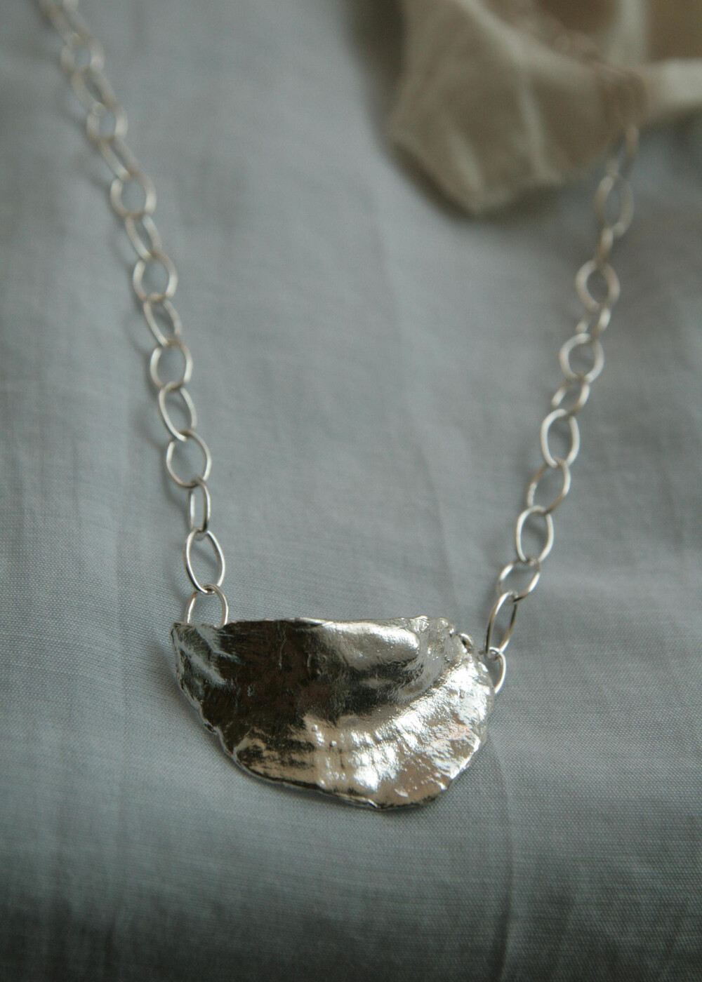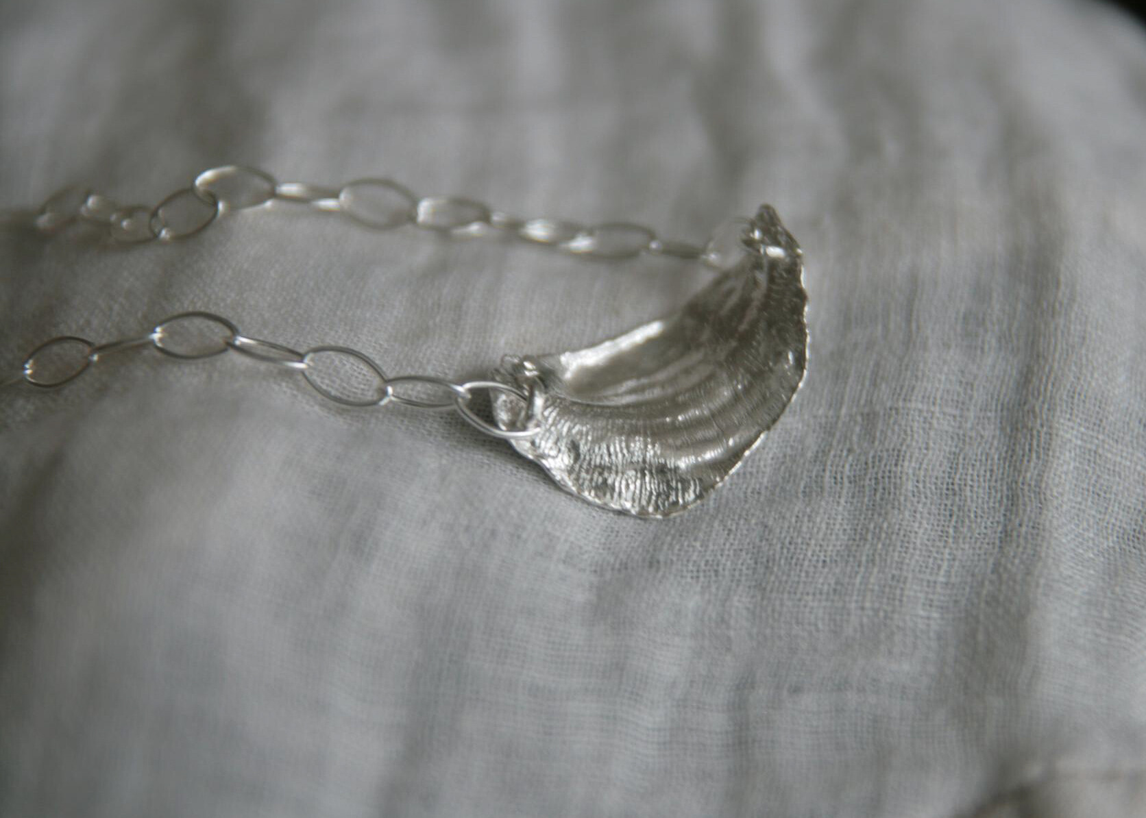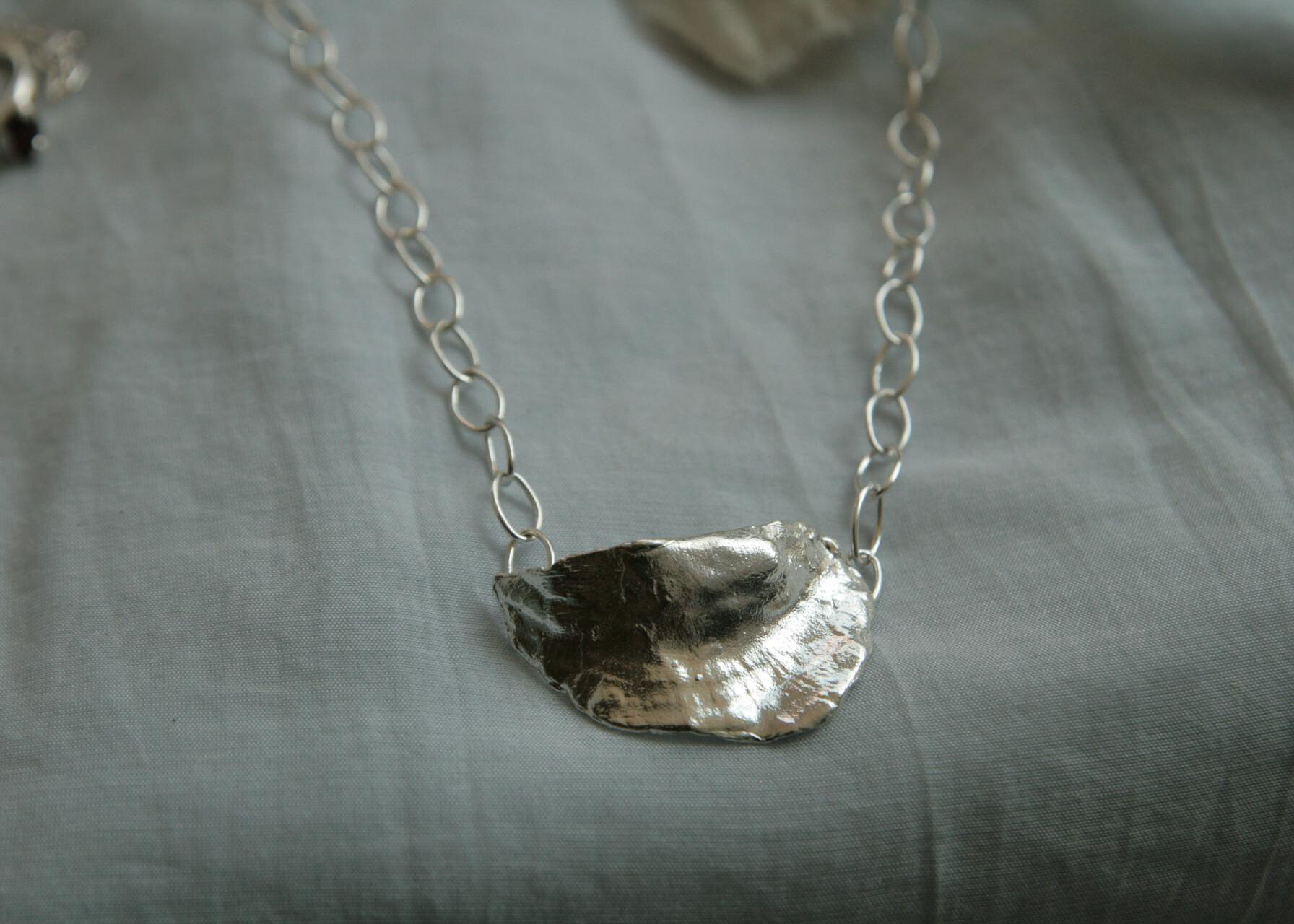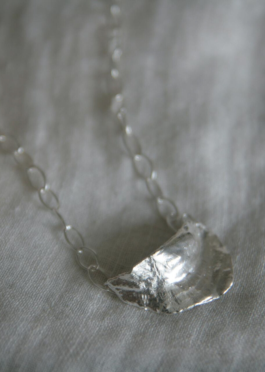 Memories of gold 의 쥬얼리, Ocean. 소라 껍데기의 텍스쳐를 지닌 넥크리스. 시원한 실버 컬러와 소라의 텍스쳐, 그리고 홀이 큰 체인들이 연결되어 여름을 생각나게 합니다. 컬러가 있는 비즈나 빈티지한 목걸이와 함께 레이어링 해 보세요. 메모리즈 오브 골드의 피스들은 모두 원앤온리 one and only 상품으로, 본 디자인으로는 단 한피스만이 제작 되었습니다.