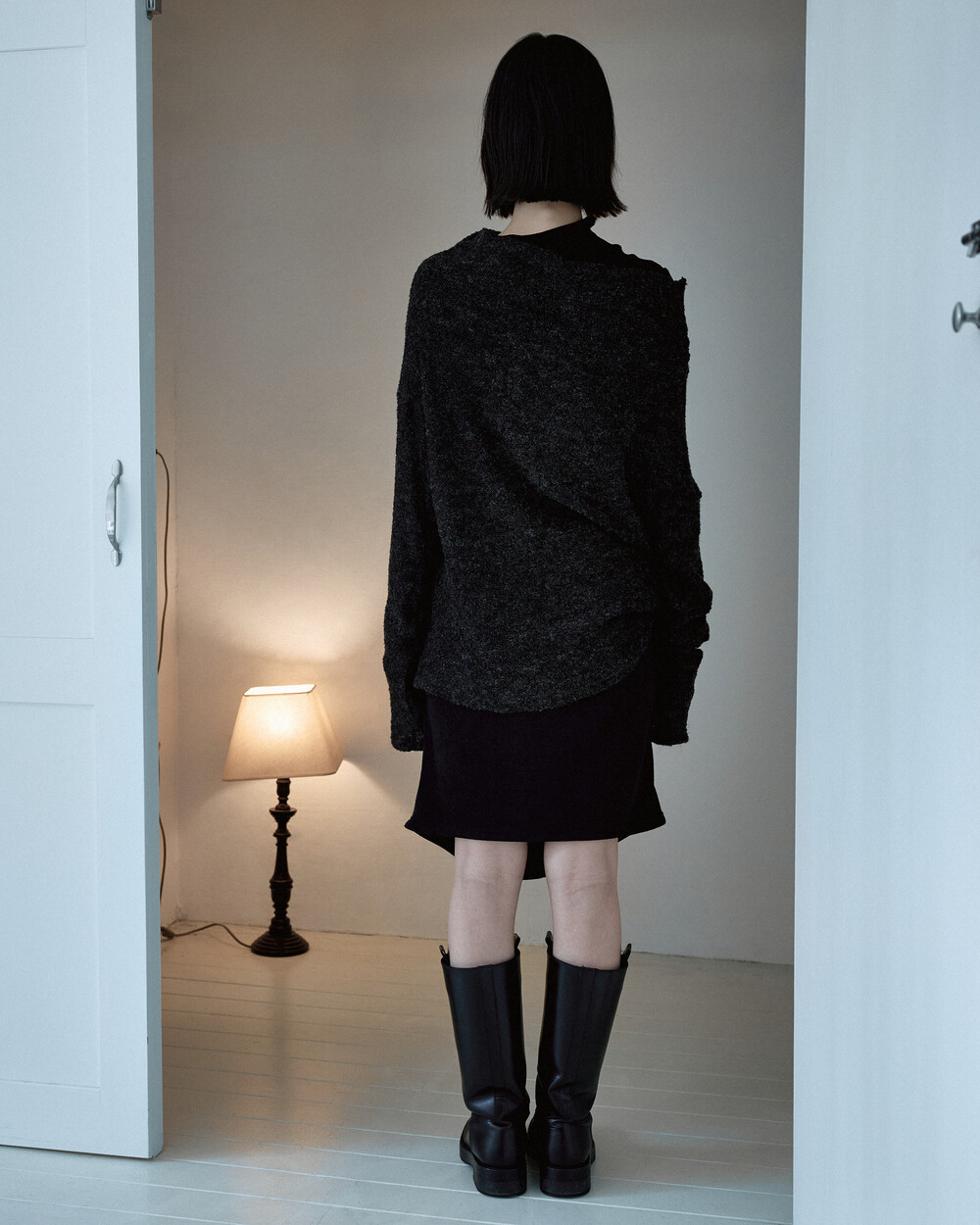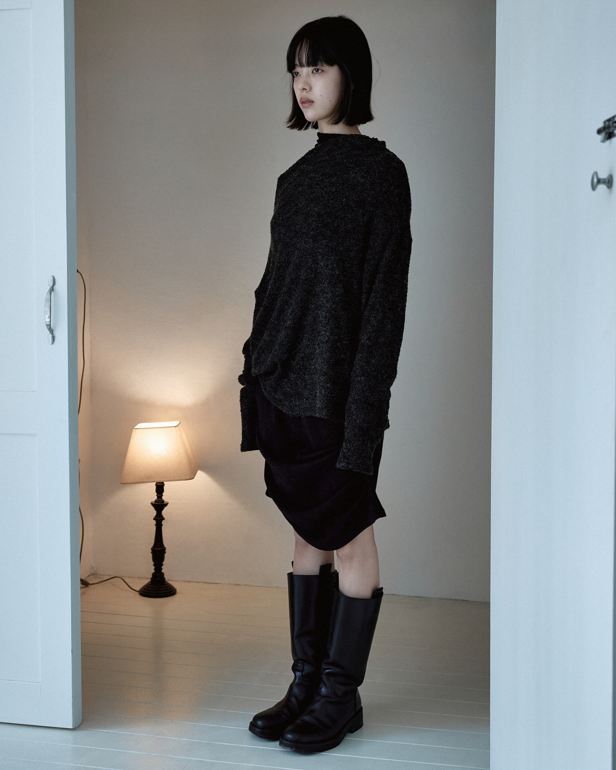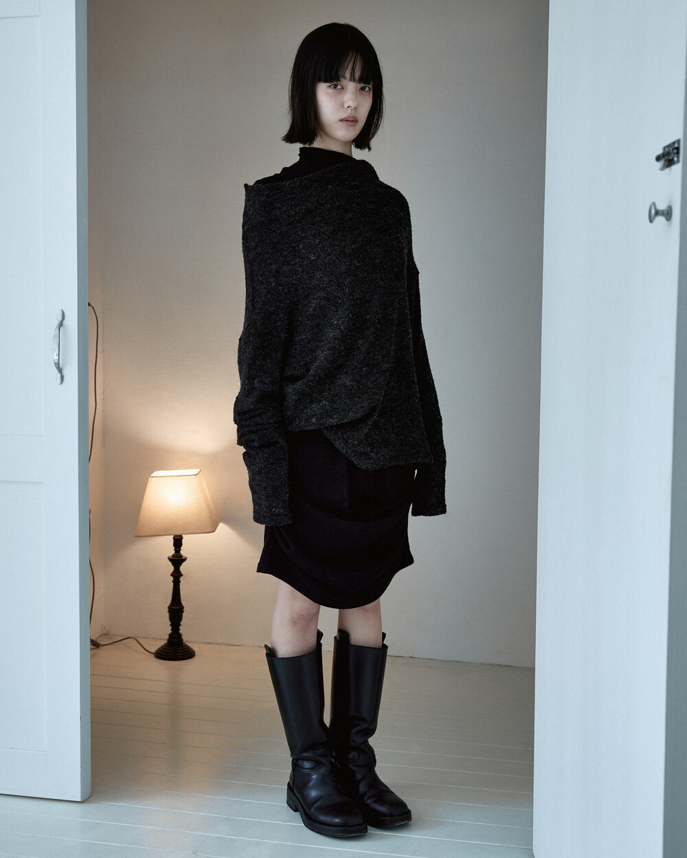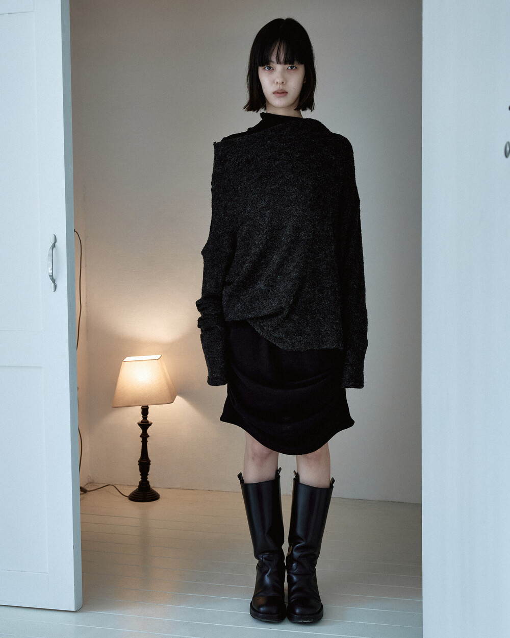 ∙ 니트 소재로 제작된 많은 볼륨의 셔링 디자인의 스커트로 앞면 부분이 자연스럽게 여러 겹의 주름으로 잡혀 풍성하고 페미넌한 실루엣으로 연출됩니다.
