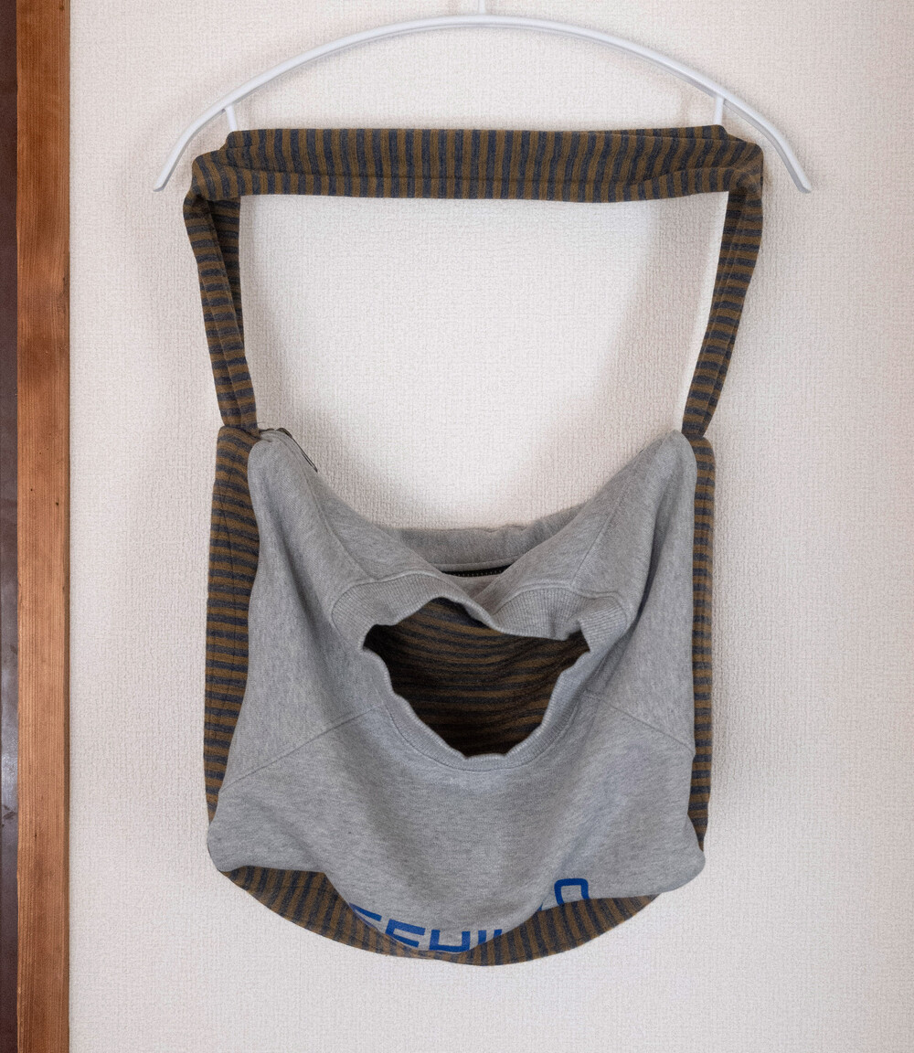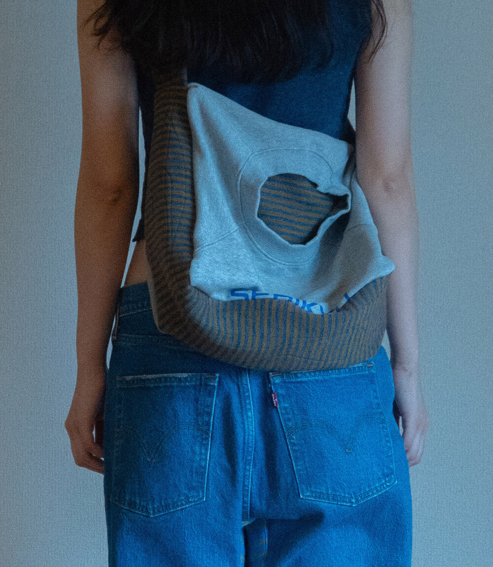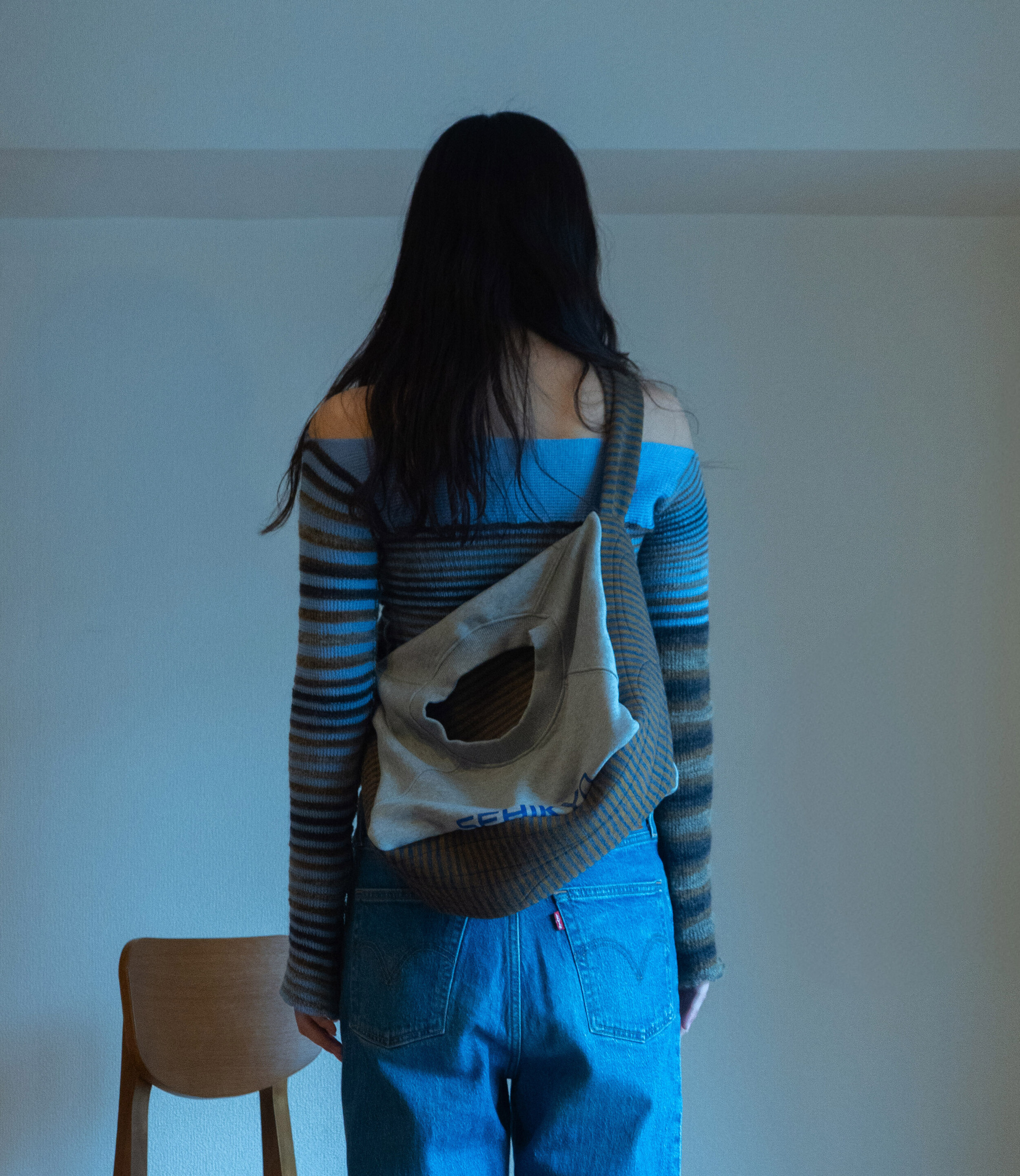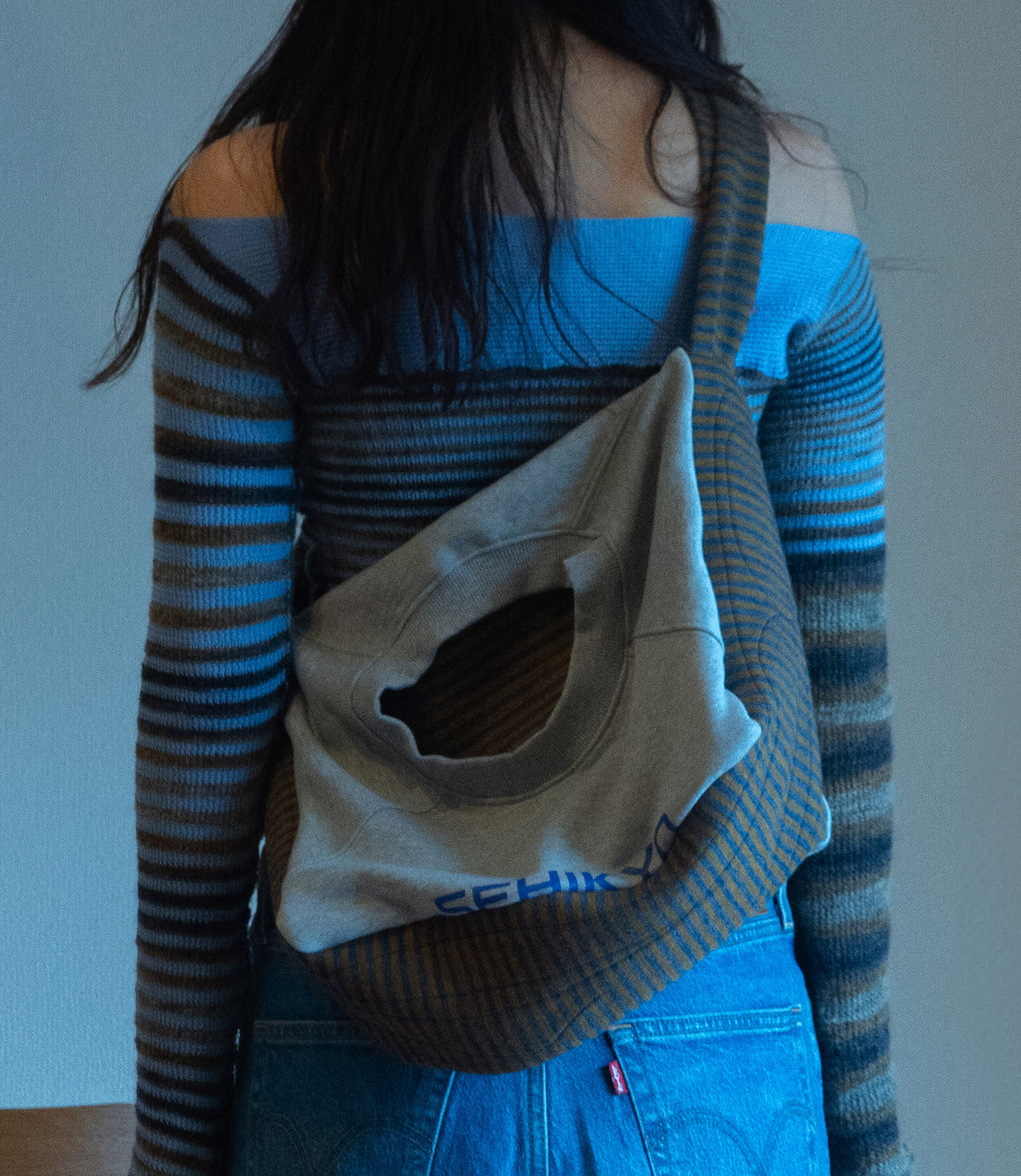 ∙ SEHIKYO 로고 스웨트셔츠를 리메이크한 가방. ∙ 스웨트셔츠 특유의 부드러운 질감과 넉넉한 수납 ∙ 공간을 갖추었으며, 지퍼 여밈이 포함되어 있습니다.